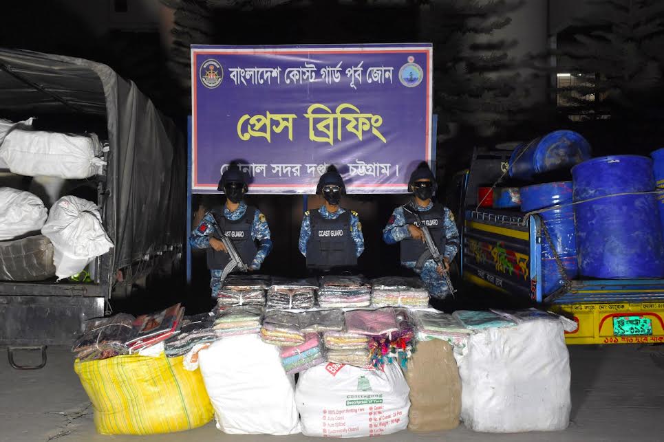 তিনি বলেন, গোপন সংবাদের ভিত্তিতে জানা যায়, চট্টগ্রামের কোতোয়ালি থানাধীন খাতুনগঞ্জের ১টি গোডাউনে শুল্ক-কর ফাঁকি দিয়ে আসা বিপুল পরিমাণ ভারতীয় বস্ত্র সামগ্রী ও ভেজাল দ্রব্যাদি মজুত করা হয়েছে। প্রাপ্ত তথ্যের ভিত্তিতে গত ২৬ জানুয়ারি সোমবার বিকাল ৪টায় কোস্ট গার্ড বেইস চট্টগ্রাম ও পুলিশের সমন্বয়ে উক্ত এলাকায় একটি যৌথ অভিযান পরিচালনা করা হয়। অভিযান চলাকালীন গোডাউনটি তল্লাশি করে প্রায় ৪ কোটি টাকা মূল্যের অবৈধভাবে শুল্ক কর ফাঁকি দিয়ে আসা বিপুল পরিমাণ ভারতীয় শাড়ি, থ্রি পিস, কাচের বোতল, প্লাস্টিকের বোতল, প্লাস্টিকের বস্তা, ভেজাল ওলিভ ওয়েল ও ওলিভ ওয়েল তৈরির উপকরণ এবং বোতলের লেভেলিং জব্দ করা হয়। এসময় অবৈধ ব্যবসায়ীরা যৌথ বাহিনীর উপস্থিতি টের পেয়ে পালিয়ে যাওয়ায় কাউকে আটক করা সম্ভব হয়নি।