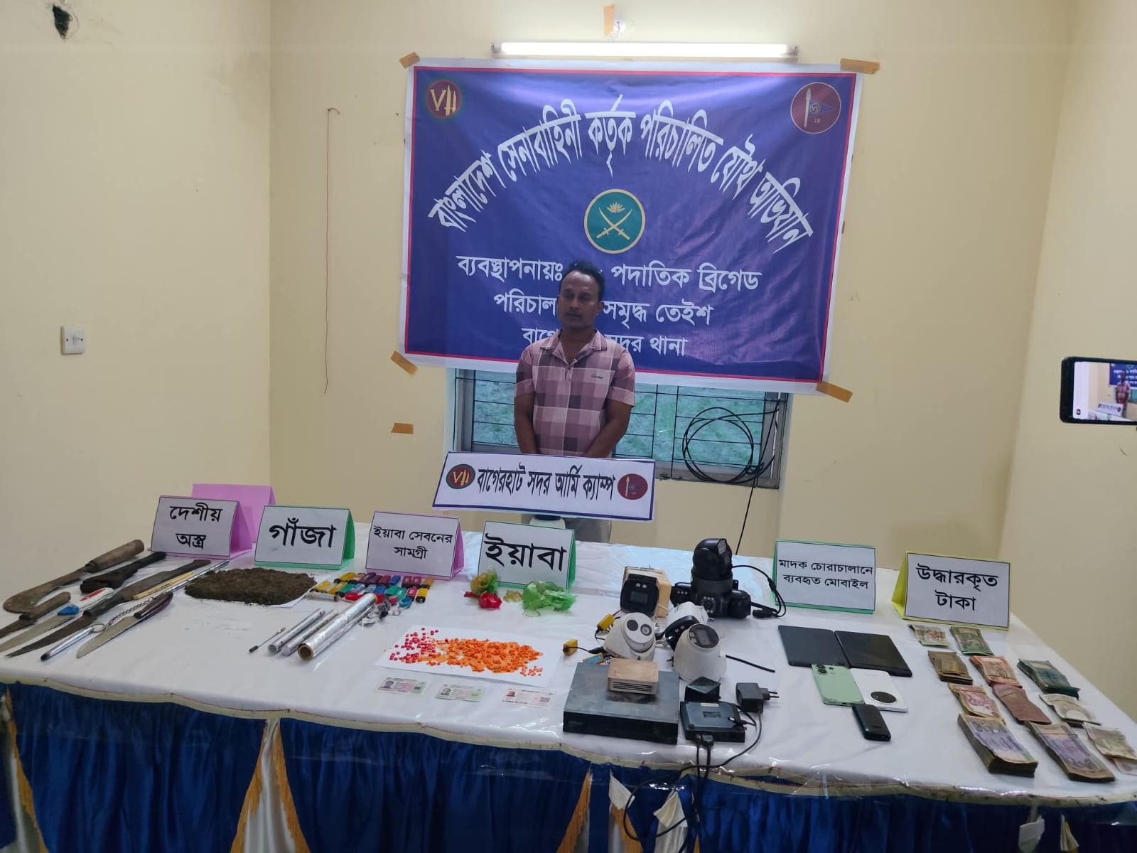 জব্দকৃত মালামালের মধ্যে রয়েছে ১ লাখ ৬০ হাজার ১০৮ টাকা নগদ, ৫টি মোবাইল ফোন, ৮টি সিসি ক্যামেরা, ১টি হার্ডডিস্ক, ৩টি আইডি কার্ড, ২০টি লাইটার, ইয়াবা সেবনের বিভিন্ন উপকরণ এবং একটি খুর।