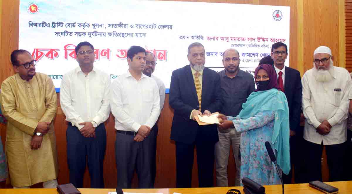 বিআরটিএ বোর্ড কর্তৃক খুলনা, সাতক্ষীরা ও বাগেরহাট জেলায় সংঘটিত সড়ক দুর্ঘটনায় ক্ষতিগ্রস্তদের মাঝে চেক বিতরণ অনুষ্ঠান আজ (বৃহস্পতিবার) খুলনা জেলা প্রশাসকের সম্মেলনকক্ষে অনুষ্ঠিত হয়। অনুষ্ঠানে প্রধান অতিথি ছিলেন বাংলাদেশ সড়ক পরিবহন কর্তৃপক্ষ (বিআরটিএ’র) চেয়ারম্যান আবু মমতাজ সাদ উদ্দিন আহমেদ।