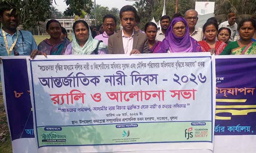 দাকোপ প্রতিনিধি :: আজকের পদক্ষেপ, আগামীর ন্যায় বিচার সুরক্ষিত হোক নারী ও কন্যার অধিকার এই প্রতিপাদ্য বিষয়কে সামনে রেখে খুলনার দাকোপে আন্তর্জতিক নারী দিবস ২০২৬ পালন উপলক্ষে র্যালী ও আলোচনা সভা অনুষ্ঠিত হয়েছে। উপজেলা প্রশাসন ও মহিলা বিষয়ক অধিদপ্তরের যৌথ উদ্যোগে এবং এএসডিডিডাব্লুসহ বিভিন্ন এনজিও’র সহযোগীতায় এদিবসটি পালন করা হয়।