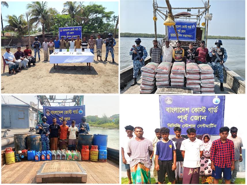 অপরদিকে ১১ এপ্রিল রাত ১২টায় ও ৩টায় কোস্ট গার্ড বেইস চট্টগ্রাম এবং কোস্ট গার্ড স্টেশন মহেশখালী কর্তৃক চট্টগ্রামের সদরঘাট থানাধীন শাহ আমানত ব্রিজ সংলগ্ন এলাকায় ও কক্সবাজারের বাকখালী নদীর মোহনা সংলগ্ন এলাকায় পৃথক দুইটি অভিযান পরিচালনা করা হয়। এসময় সন্দেহজনক ২টি ফিশিং বোটে তল্লাশি চালিয়ে অবৈধভাবে শুল্ক-কর ফাঁকি দিয়ে মায়ানমারে পাচারের উদ্দেশ্যে বহনকৃত ১ম বোট থেকে প্রায় ৬ লক্ষ ৭১ হাজার টাকা মূল্যের ৫ হাজার লিটার ডিজেল, ৫৪ লিটার ইঞ্জিন কুল্যান্ট, ৭০ লিটার গিয়ার অয়েল, ৪০ লিটার সুপার মোটর অয়েল, ১টি ডিজেল ইঞ্জিন, ৪টি গ্যাস সিলিন্ডারসহ ৩জন পাচারকারী এবং ২য় বোট থেকে প্রায় ৩ লক্ষ ১৫ হাজার টাকা মূল্যের ৪৫০ বস্তা সিমেন্টসহ ৫জন পাচারকারীকে আটক করা হয়।