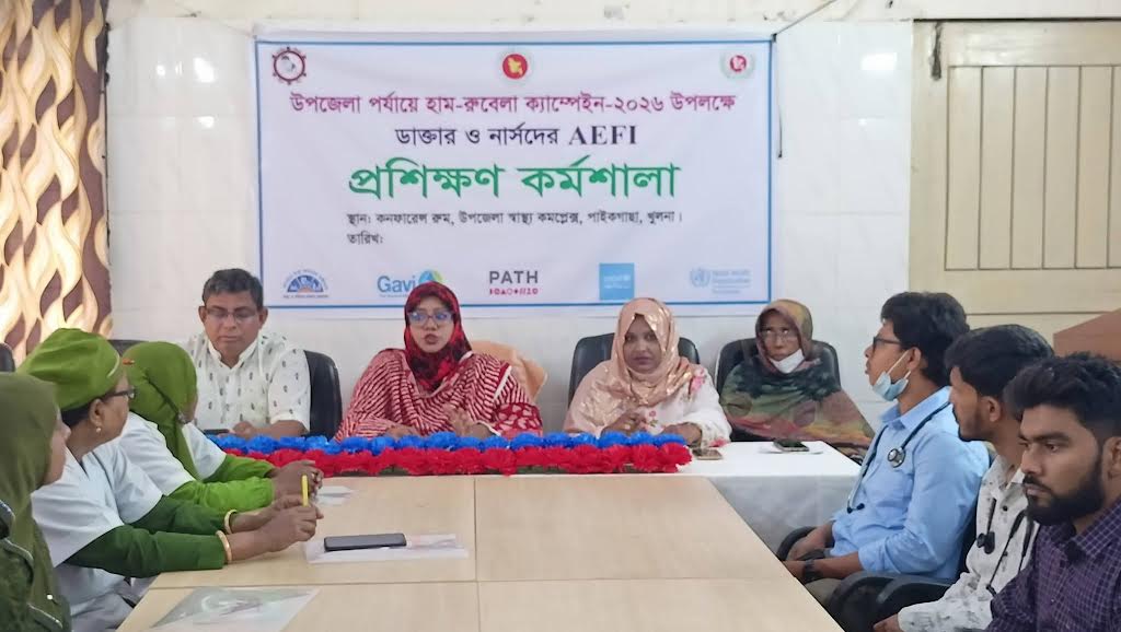 পাইকগাছা (খুলনা) প্রতিনিধি::: হাম-রুবেলা (এমআর) ভ্যাকসিন ক্যাম্পেইন-২০২৬ সফলভাবে বাস্তবায়নের লক্ষ্যে পাইকগাছা উপজেলা স্বাস্থ্য বিভাগের উদ্যোগে ডাক্তার ও নার্সদের অংশগ্রহণে “এইএফআই (Adverse Events Following Immunization)” বিষয়ক এক প্রশিক্ষণ কর্মশালা অনুষ্ঠিত হয়েছে।