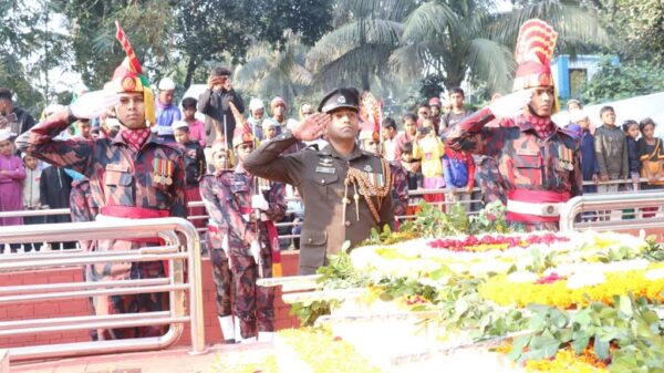 বেনাপোল প্রতিনিধি:: মহান বিজয় দিবস উপলক্ষে যথাযোগ্য মর্যাদায় বীরশ্রেষ্ঠ শহীদ ল্যান্স নায়েক নূর মোহাম্মদ শেখ এর সমাধিতে পুষ্পস্তবক অর্পন ও দোয়া অনুষ্ঠানের আয়োজন করেছে বিজিবি। আজ মঙ্গলবার (১৬ ডিসেম্বর) সকাল