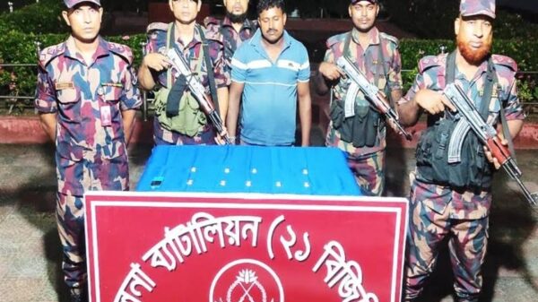 বেনাপোল প্রতিনিধি:: যশোরের শার্শা উপজেলার বেনাপোল পোর্ট থানার পুটখালী বিজিবি ক্যাম্পের সদস্যরা অভিযান চালিয়ে ১ কেজি ৪৯ গ্রাম ওজনের ৯ পিস স্বর্ণের বারসহ মনিরুজ্জামান (৩৭) নামে এক স্বর্ণ পাচারকারীকে আটক