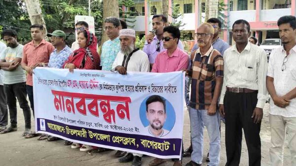 চিতলমারী প্রতিনিধি:: বাগেরহাটে প্রকাশ্যে সাংবাদিক এস এম হায়াত উদ্দিনকে হত্যার প্রতিবাদ ও হত্যাকান্ডে জড়িতদের বিচারের দাবীতে চিতলমারীতে মানববন্ধন এবং প্রতিবাদ সভা অনুষ্ঠিত হয়েছে। রোববার (৫ সেপ্টেম্বর) বেলা ১২ টায় উপজেলা