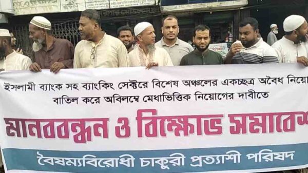 বেনাপোল প্রতিনিধি:: ইসলামী ব্যাংকসহ দেশের সকল ব্যাংকিং খাতে এস আলম গ্রুপের ‘অবৈধ নিয়োগ ও একচ্ছত্র দখলদারিত্ব’ বাতিলের দাবিতে মানববন্ধন করেছে বেনাপোল ইসলামী ব্যাংক গ্রাহক ফোরাম ও বৈষম্যবিরোধী চাকুরী প্রত্যাশীরা। সোমবার