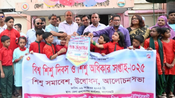 বাগেরহাট প্রতিনিধি:: শিশুর কথা শুনবো আজ,শিশুর জন্য করব কাজ” এই প্রতিপাদ্যের আলোকে মহিলা ও শিশু বিষয়ক মন্ত্রণালয়ের নির্দেশনায়,জেলা প্রশাসন ও বাংলাদেশ শিশু একাডেমি বাগেরহাট জেলা কার্যালয়ের উদ্যোগে ০৬ (অক্টোবর) সোমবার