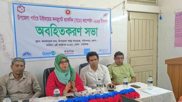 পাইকগাছা (খুলনা) প্রতিনিধি:: পাইকগাছা উপজেলা স্বাস্থ্য বিভাগের উদ্যোগে “টাইফয়েড কনজুগেট ভ্যাকসিন (TCV) ক্যাম্পেইন–২০২৫ উপলক্ষে এক অবহিতকরণ সভা অনুষ্ঠিত হয়েছে। সোমবার (৬ অক্টোবর সকালে উপজেলা স্বাস্থ্য কমপ্লেক্সের সভাকক্ষে আয়োজিত এ অনুষ্ঠানে