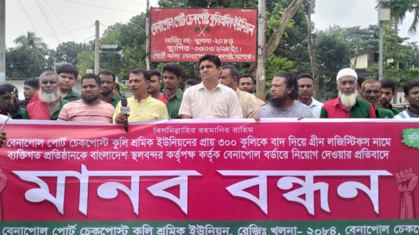 বেনাপোলে ৩০০ কুলি বাদ দিয়ে গ্রীন লজিস্টিকস নামে এক প্রতিষ্ঠানকে নিয়োগের প্রতিবাদে মানববন্ধন অনুষ্ঠিত