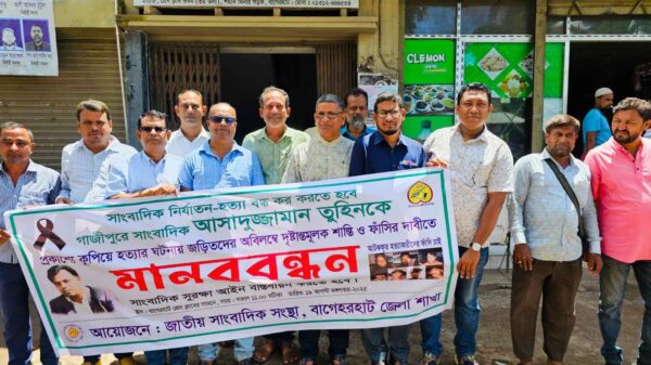 বাগেরহাটে সাংবাদিক তুহিন হত্যার প্রতিবাদে মানববন্ধন অনুষ্ঠিত