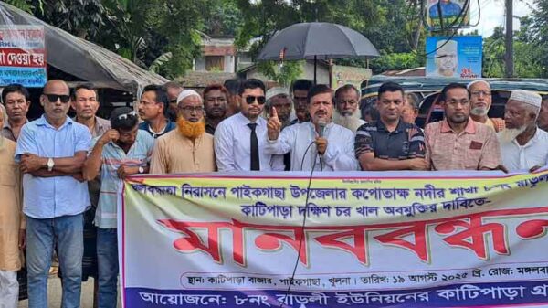 পাইকগাছায় কাঠিপাড়া খাল উম্মুক্তকরণের দাবিতে মানববন্ধন