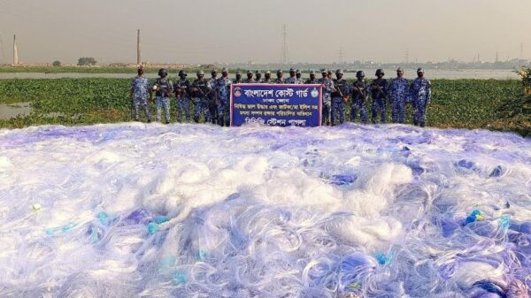 মুন্সিগঞ্জে কোস্টগার্ড ও মৎস্য অধিদপ্তরের অভিযানে নিষিদ্ধ কারেন্ট জাল জব্দ